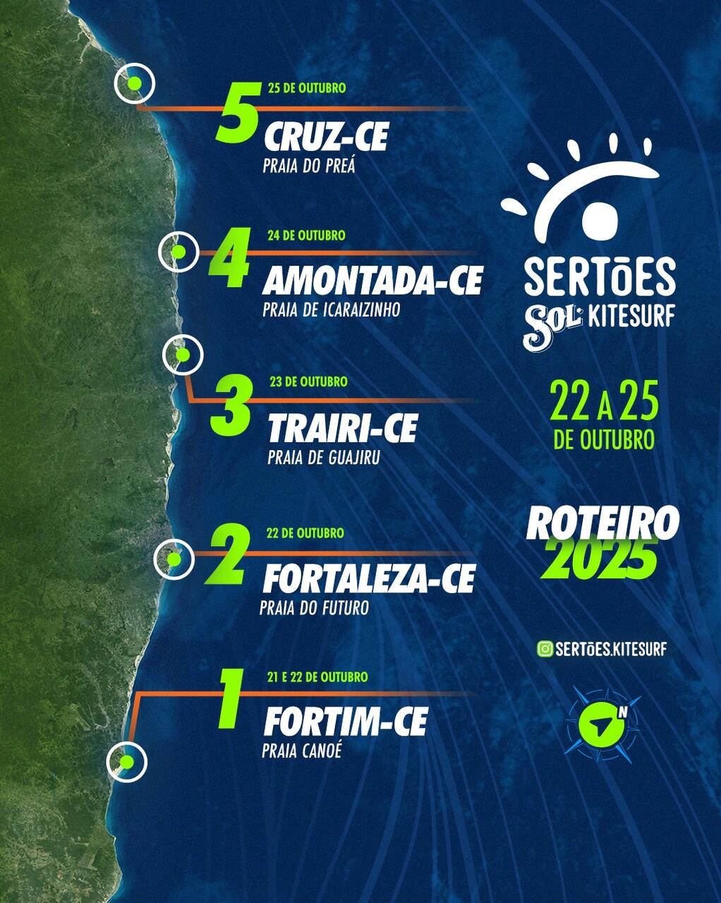 Da capital cearense, o destino será a Praia de Guajiru, em Trairi, com chegada e Vila Kite montada no Zorah Beach. A penúltima etapa terá como destino Icaraizinho de Amontada (Casa Janjão), que volta a integrar o roteiro após ser parte da primeira edição. Mais uma vez os campeões serão conhecidos no Preá, em Cruz, considerado um dos principais destinos para a prática do esporte. A Casa Luna marcará o fim do desafio e será o palco da premiação dos melhores.