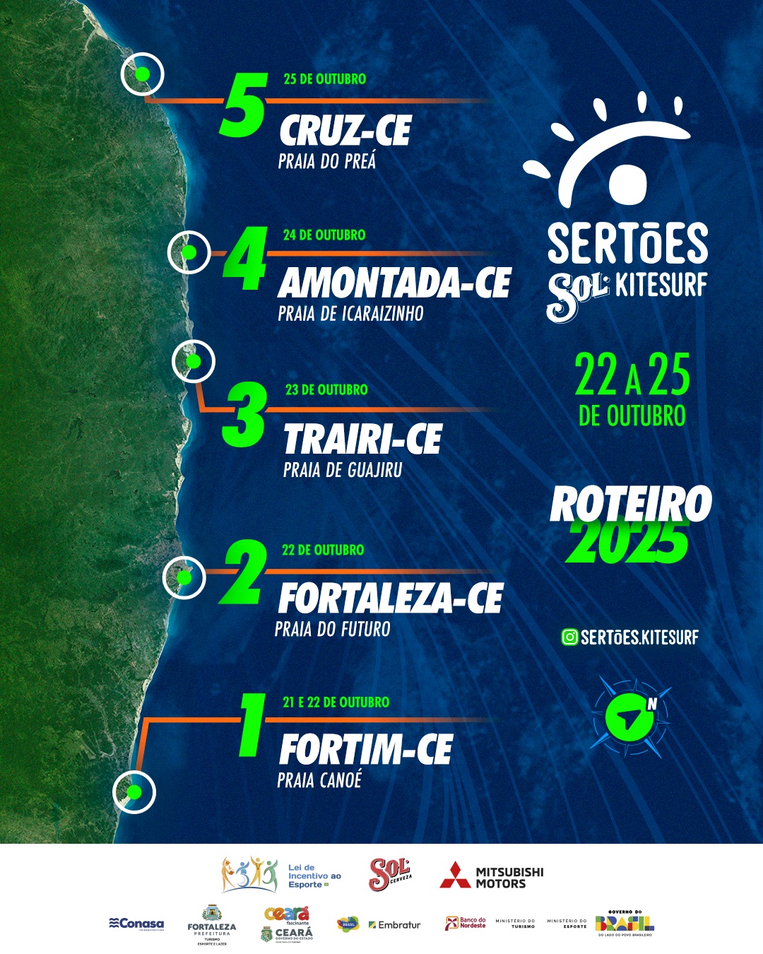 O Sol Sertões Kitesurf chega em 2025 à sua quinta edição. De 22 a 25 de outubro, o litoral do Ceará volta a receber o maior rally da modalidade no planeta. A partir de Fortim (Jaguaribe Lodge & Kite), os inscritos seguirão no primeiro dia rumo à Praia do Futuro, em Fortaleza (P5 Kite House).